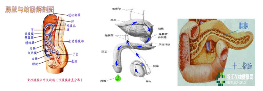腑与腑之间的关系在所有教科书中没有腑与腑的生理和病理论述,而临床医疗中,腑与腑合病和同病的占了整个临床医疗的主体。如胆、胃、肠三腑合病和同病是临床上最多和常见的,从生理特点来看,胆管和胰腺都开口于胃十二指肠,胆汁参与人体的脂肪消化,胰腺参与糖的代谢,胰蛋白酶参与蛋白质的分解和消化等。一旦胃、十二肠患病出现痉挛,就影响到胆汁排泄,既会出现胆汁返流,也可引起大便不畅,还可引发黄疸和皮肤瘙痒;既可出现胃痛背胀的临床症状,也可引起胰腺疾患。如胰头水肿、胰腺炎、突发性死亡等都与胆、胃、胰三腑有关。